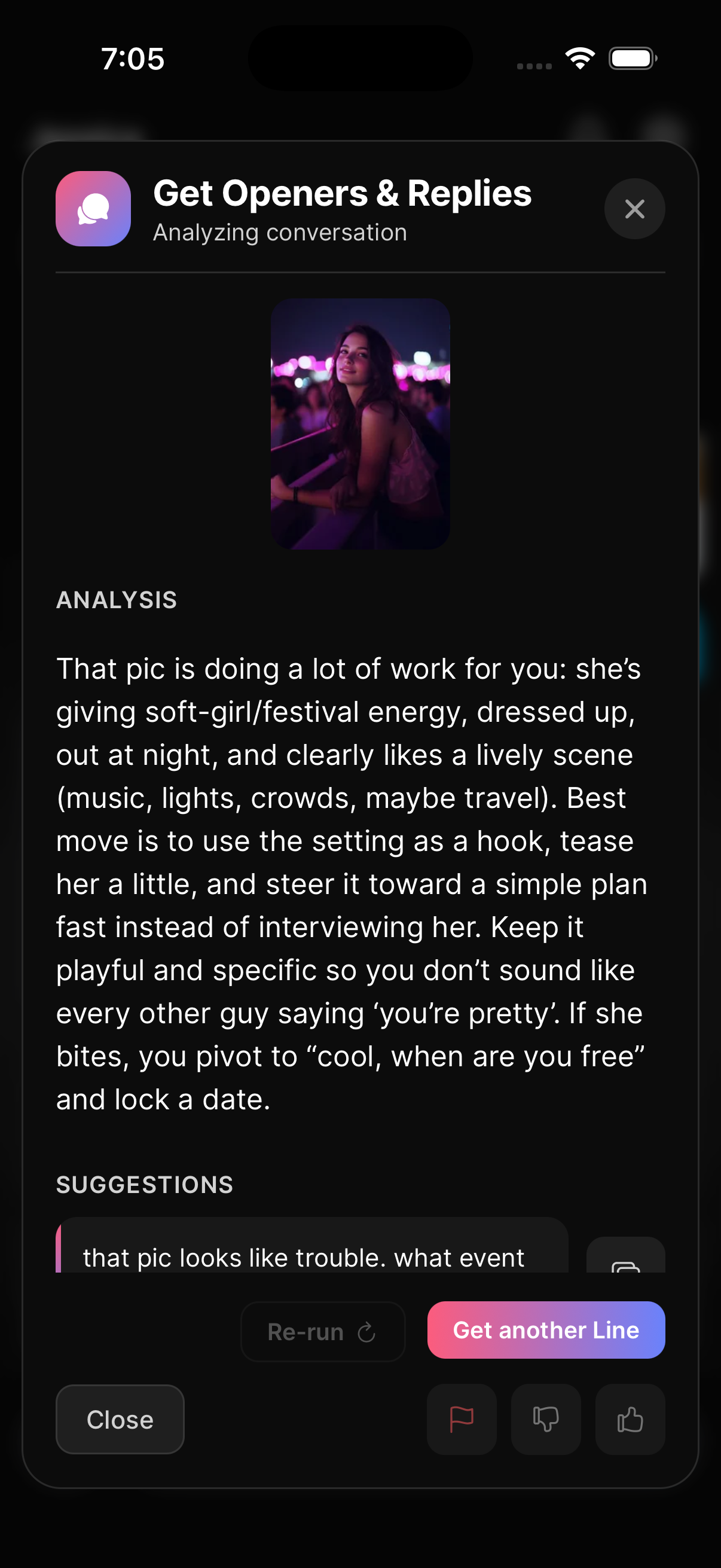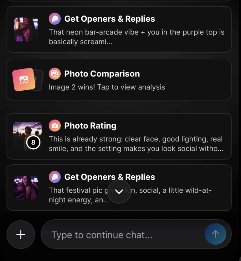 Your chat history becomes the running record of every photo rating, every conversation analysis, every piece of advice you've ever gotten. It's all there to scroll back through.