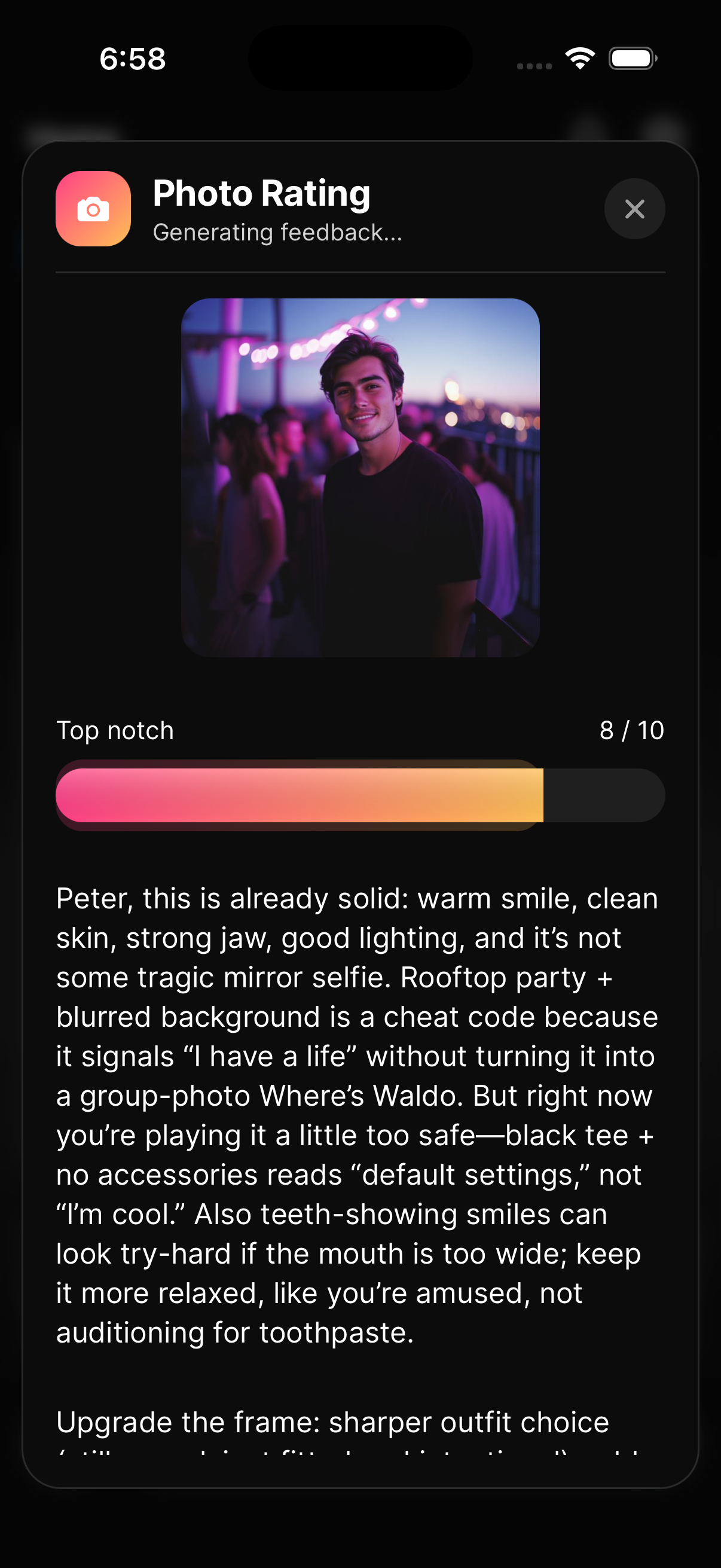 Tip: Test multiple photos before updating your profile. Rate them all, compare the feedback, and lead with the one that scores highest.