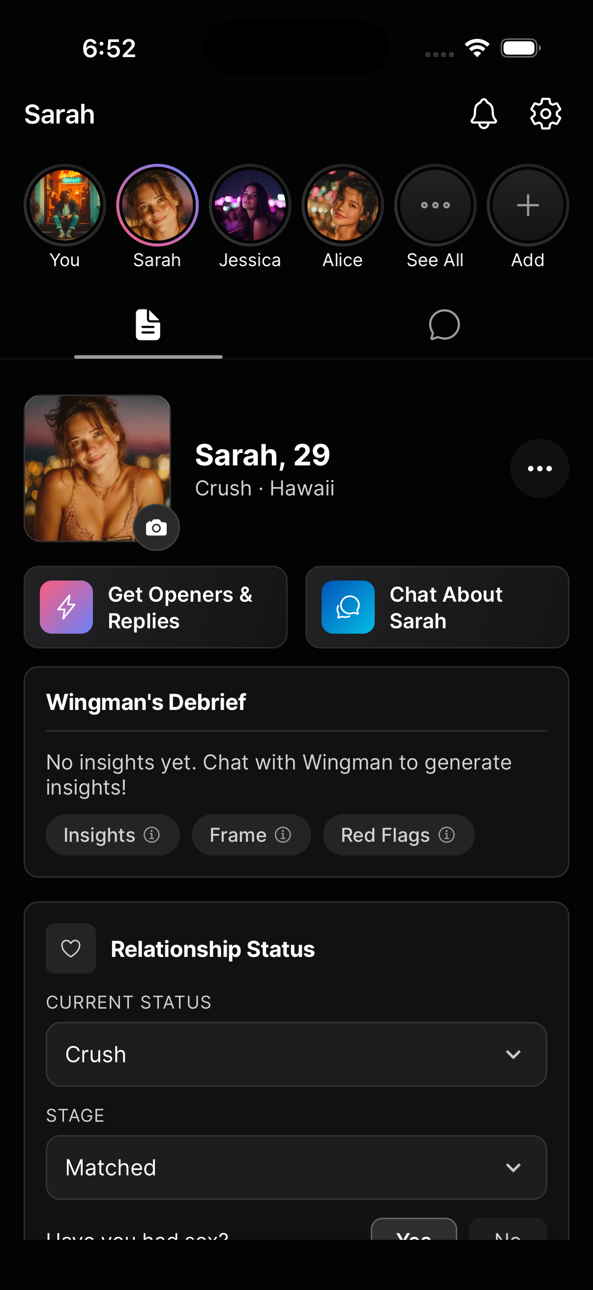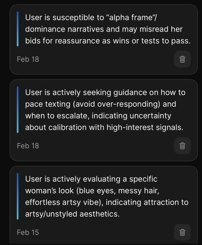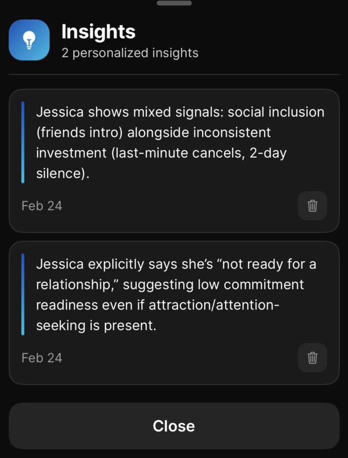 Each romantic interest also has their own insights, visible in the Dossier. These are specific to that person and update automatically as you chat with Wingman about them. Things like patterns in her communication, shifts in interest level, or dynamics you might not have noticed.