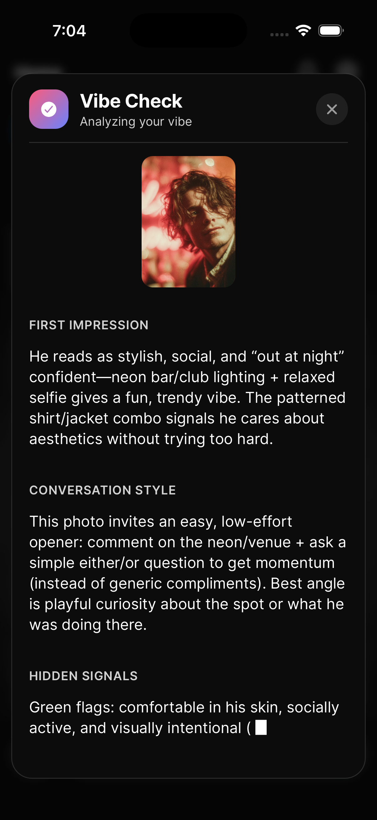 Before you hit send, run it through Vibe Check. Upload screenshots of the conversation for context, and Wingman analyzes how your messages read. Are you coming across as confident or needy? Interested or desperate? You'll get an honest read on your texting style with specific suggestions to tighten it up.