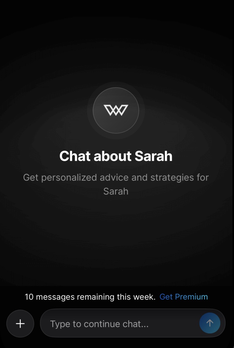 But here's where it gets powerful. When you add a romantic interest (someone you're talking to, dating, or interested in), they get their own dedicated chat. One thread, just for them. When you're in Sarah's chat and you ask "what should I text her?", Wingman already knows you're talking about Sarah. It knows her attachment style, what stage you're at, what's happened before. You don't have to re-explain the backstory every time.