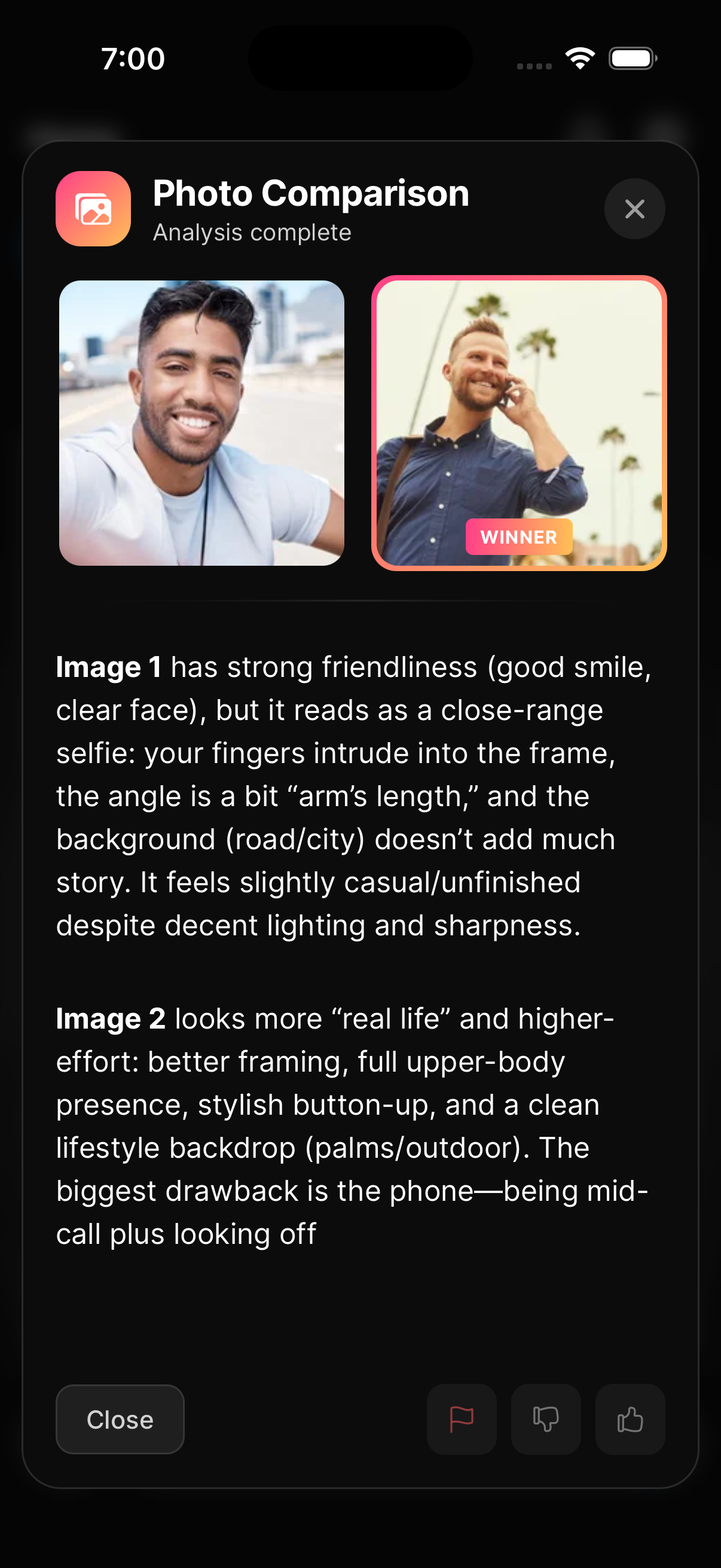 Can't decide between two photos? Compare Photos puts them side by side and tells you which one is stronger and why. It's the fastest way to figure out which photo should lead your profile.