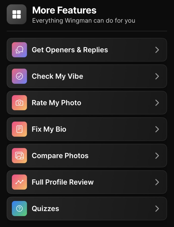 That's everything. One chat for general advice, one chat for each person you're talking to, and a full suite of tools to help you at every stage — from picking your best photo to knowing exactly what to text next.