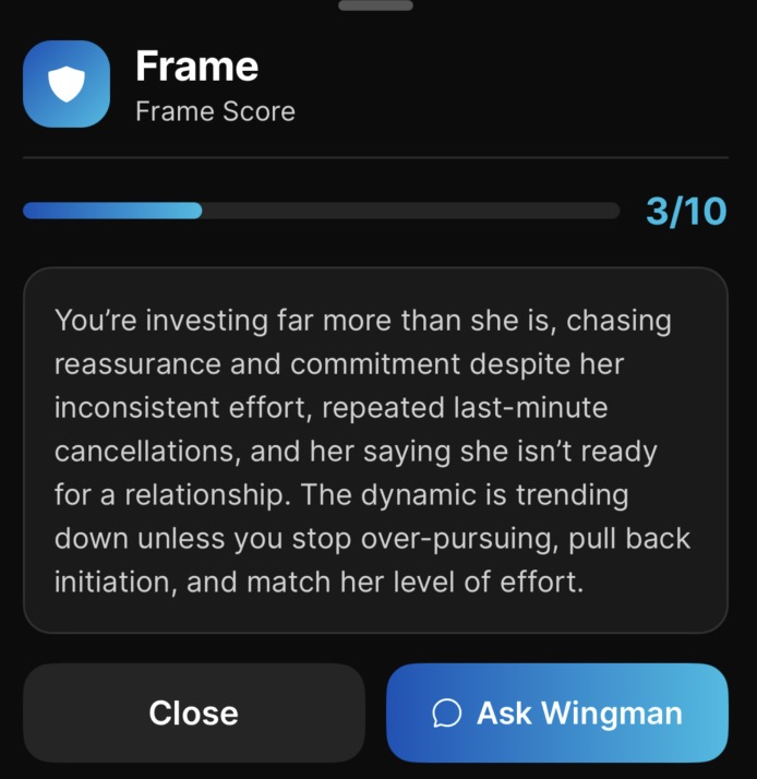 Each romantic interest has a Frame Score, a rating that reflects where you stand in the dynamic. It tracks who's chasing whom, whether you're holding your frame, and how the balance is shifting. Tap the score in the Dossier for a full breakdown and actionable advice on how to improve your position.