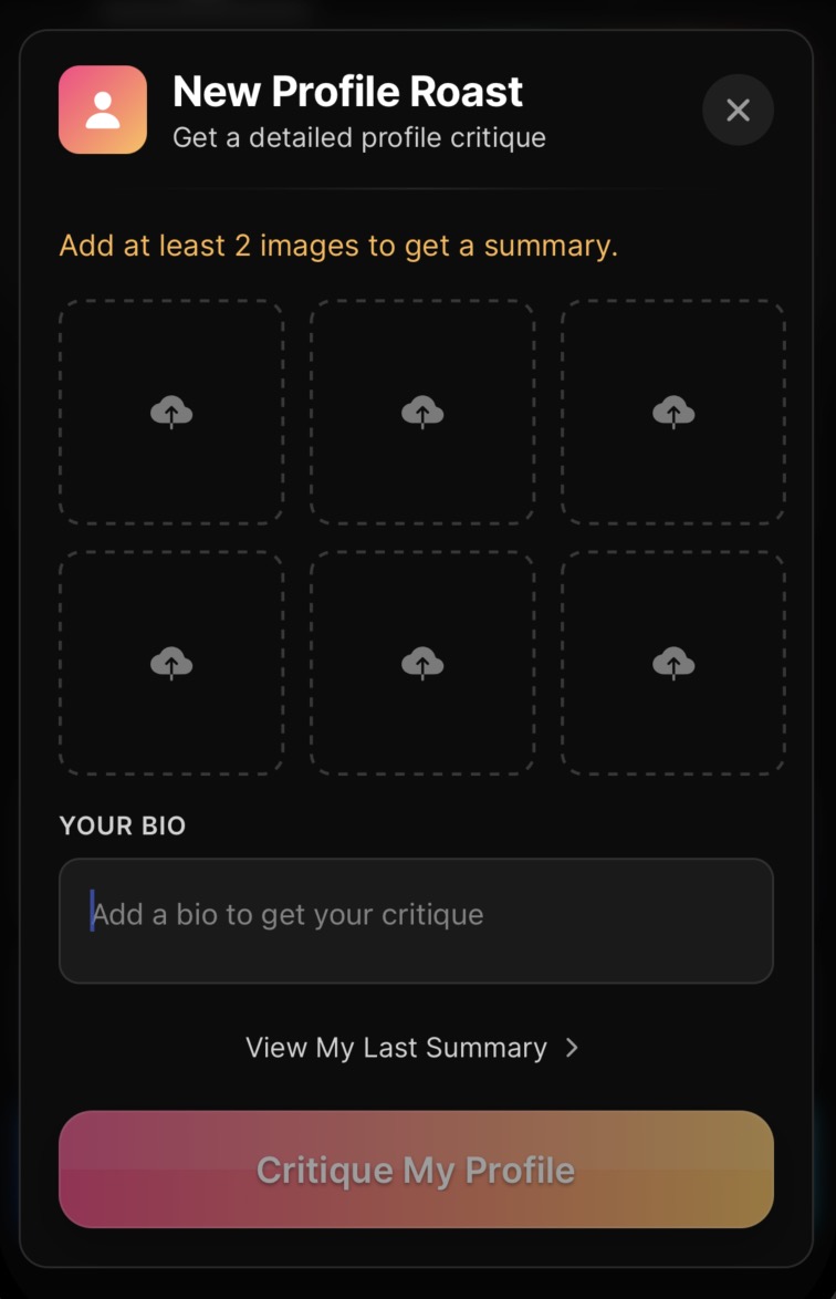 The most comprehensive profile tool. Instead of rating one photo or just your bio, a Full Profile Review analyzes your photos and bio together, the way she actually sees your profile. You'll get feedback on photo order, bio effectiveness, overall impression, and specific steps to improve.