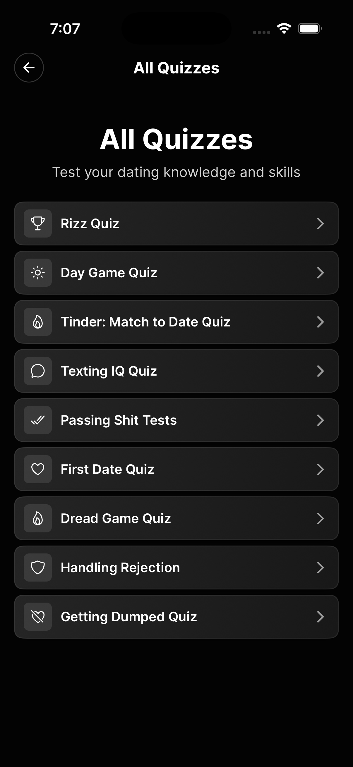Test your dating knowledge with scenario-based quizzes. Each quiz presents real-world situations (hookups, crushes, exes, online dating) and scores your answers with honest feedback and explanations for each question.
