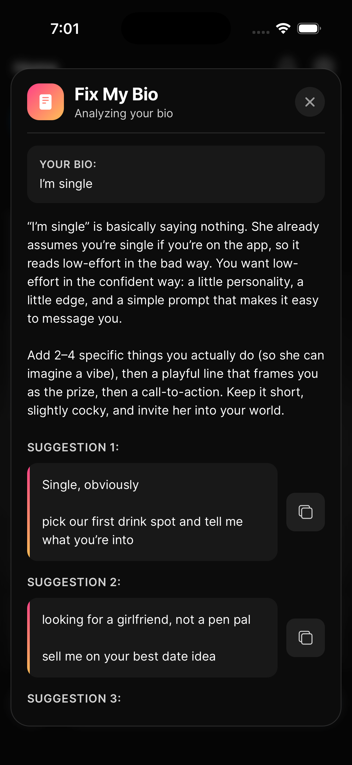 Paste in your current dating bio and get it torn apart and rebuilt. Wingman identifies what's cliche, what's actually working, and gives you a rewritten version you can copy straight to your profile.